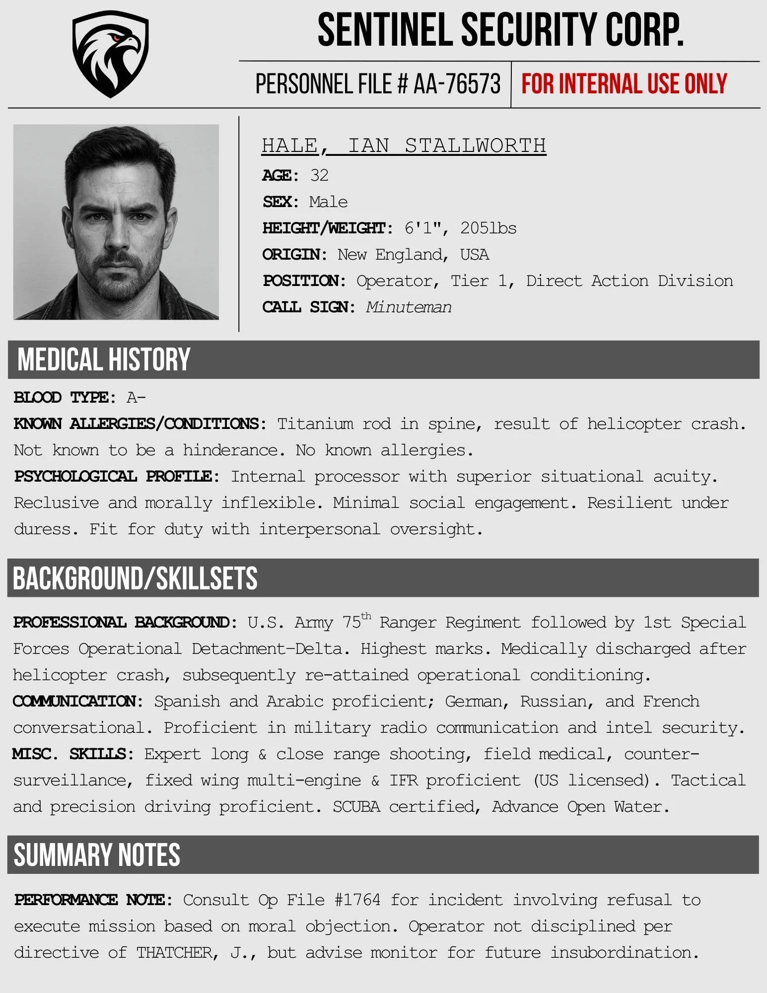 To dive a little deeper, here’s an exclusive glimpse at Ian’s classified personnel file from Sentinel, a private military contractor. Off the record, for your eyes only.
